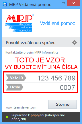 2. Počkejte chvíli, než se Vám zobrazí Vaše ID a heslo. Pracovníkům MRP technické podpory nahlaste tyto údaje.